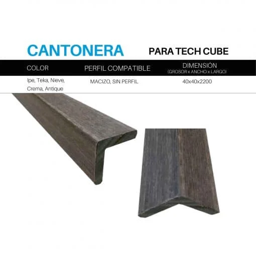 Presentamos los complementos de tarima Exterpark Magnet-Tech Cube Cantonera, una opción perfecta para aquellos que buscan realzar y proteger sus suelos de madera. Disponible en una gama de colores que incluye IPE, TEKA, NIEVE, CREMA y ANTIQUE, esta cantonera/ángulo está diseñada para combinar perfectamente con diferentes tipos de perfiles de suelos. Además, su dimensión de 40x40x2200 la hace adecuada para una variedad de espacios y estilos de decoración. Ya sea que estés buscando resaltar las características naturales de tu suelo o agregar un toque de elegancia, la cantonera Exterpark Magnet-Tech Cube es la elección perfecta para ti.